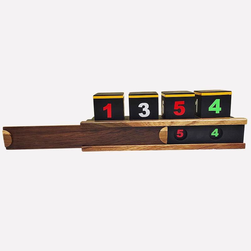 A display stand with four cubes displayed. Each cube has a variety of numbers and colours on each of four sides. Spectators freely choose how the cubes are arranged on the stand. In spite of the thousands of combinations, when the prediction is revealed, it's seen to match perfectly.